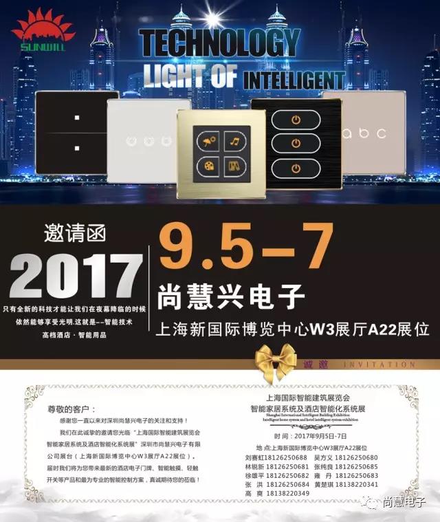 深圳市尚慧興電子有限公司展臺(tái)(上海新國(guó)際博覽中心W3展廳A22展位),本次展會(huì)我們將為您帶來(lái)新的定制電子門牌、智能觸摸開關(guān)、輕觸開關(guān)等產(chǎn)品和專業(yè)的智能控制方案,真誠(chéng)期待您的蒞臨!