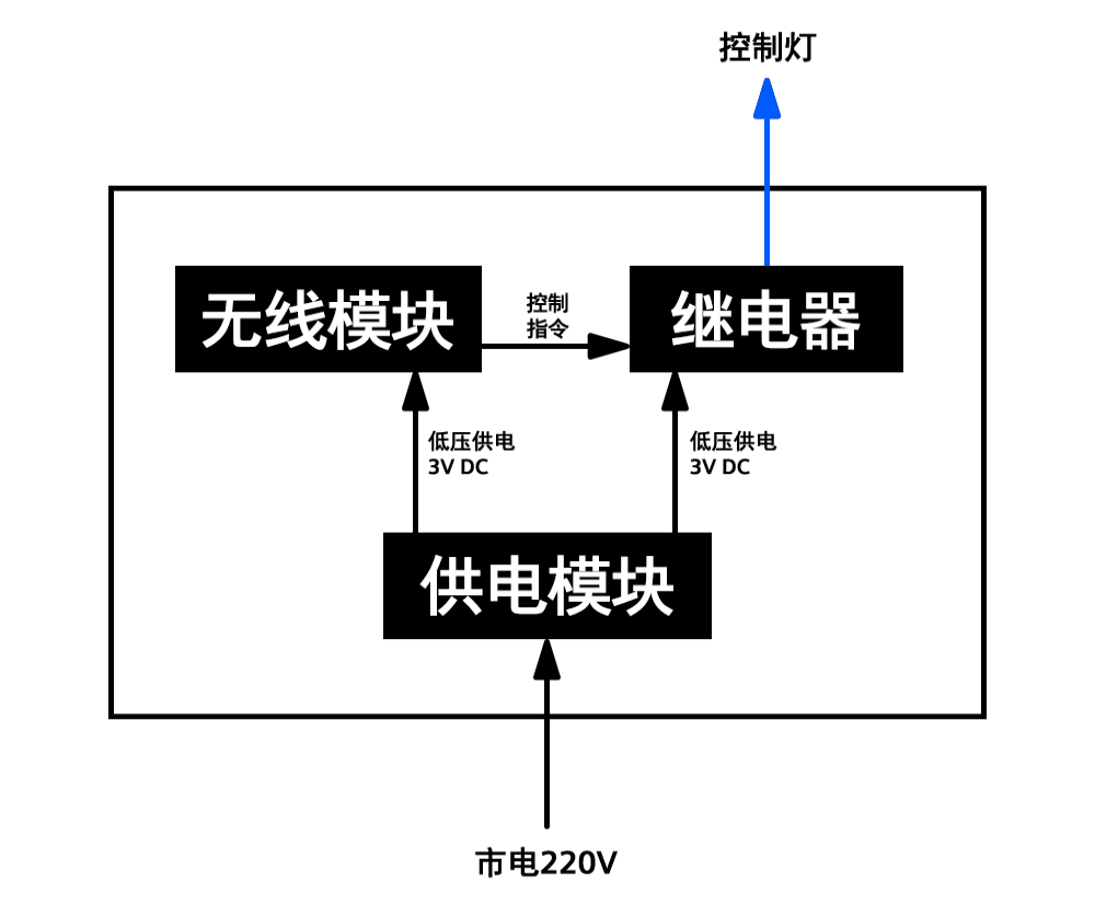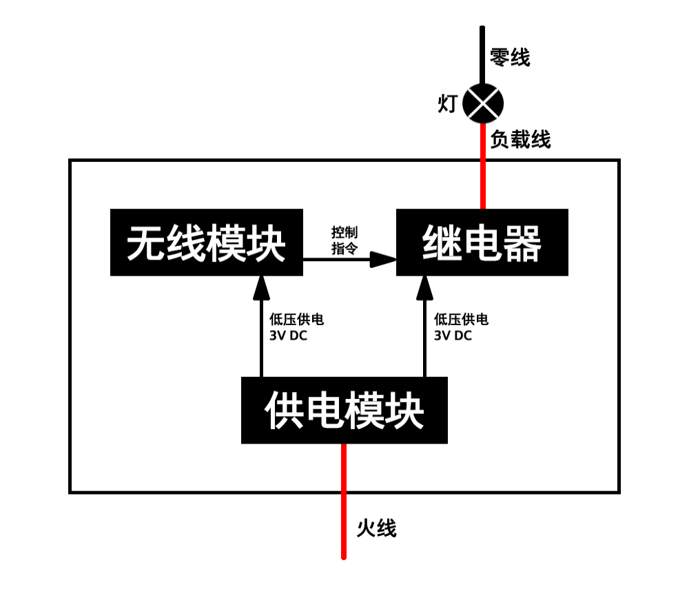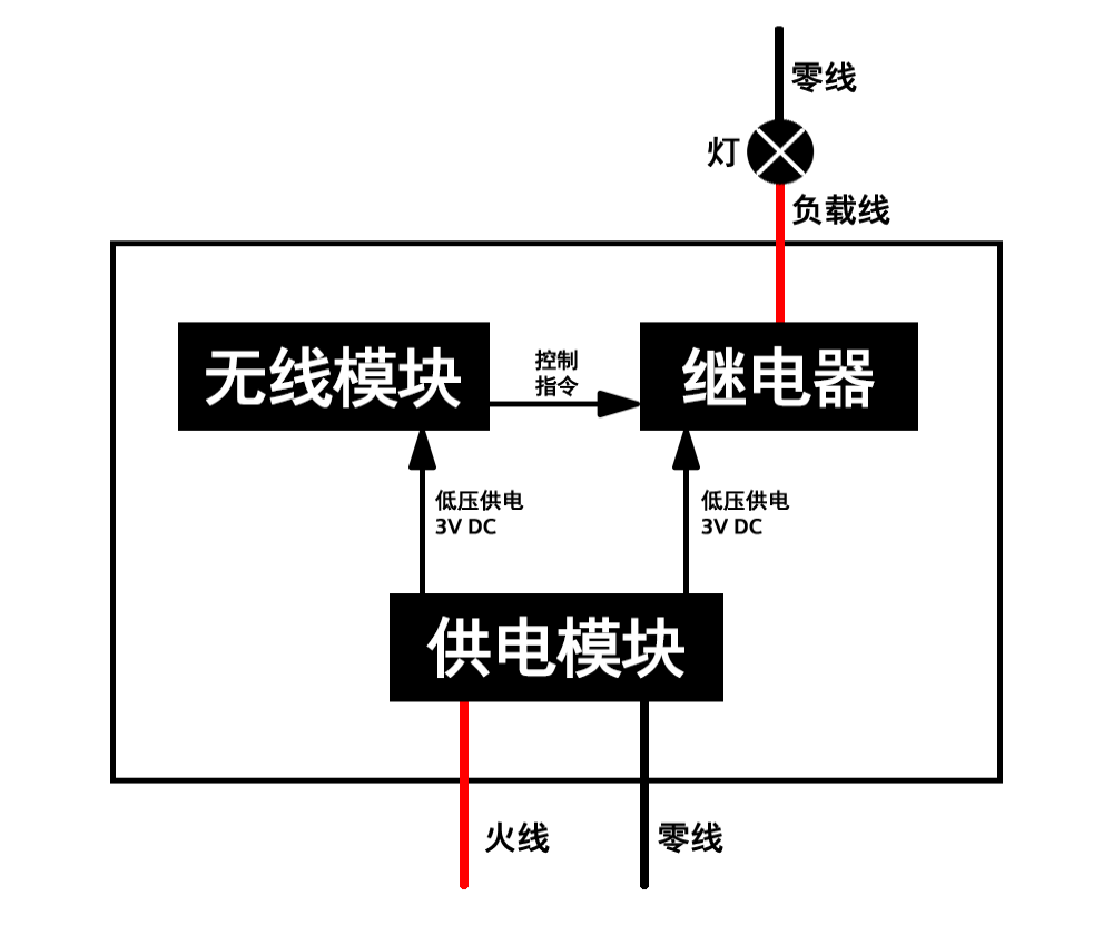 其核心組成部分為供電模塊、無(wú)線模塊和繼電器,無(wú)線模塊接收遙控器、手機(jī)APP、智能音箱等發(fā)出的指令,并將控制指令傳輸給繼電器,執(zhí)行開(kāi)和關(guān)的操作。