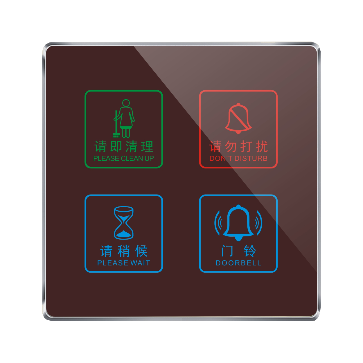3、客人按下房間內(nèi)的"請(qǐng)即清理”開關(guān),液晶屏的"請(qǐng)即清理”圖案背光亮起, 門外顯示屏中提示房間需要清理。