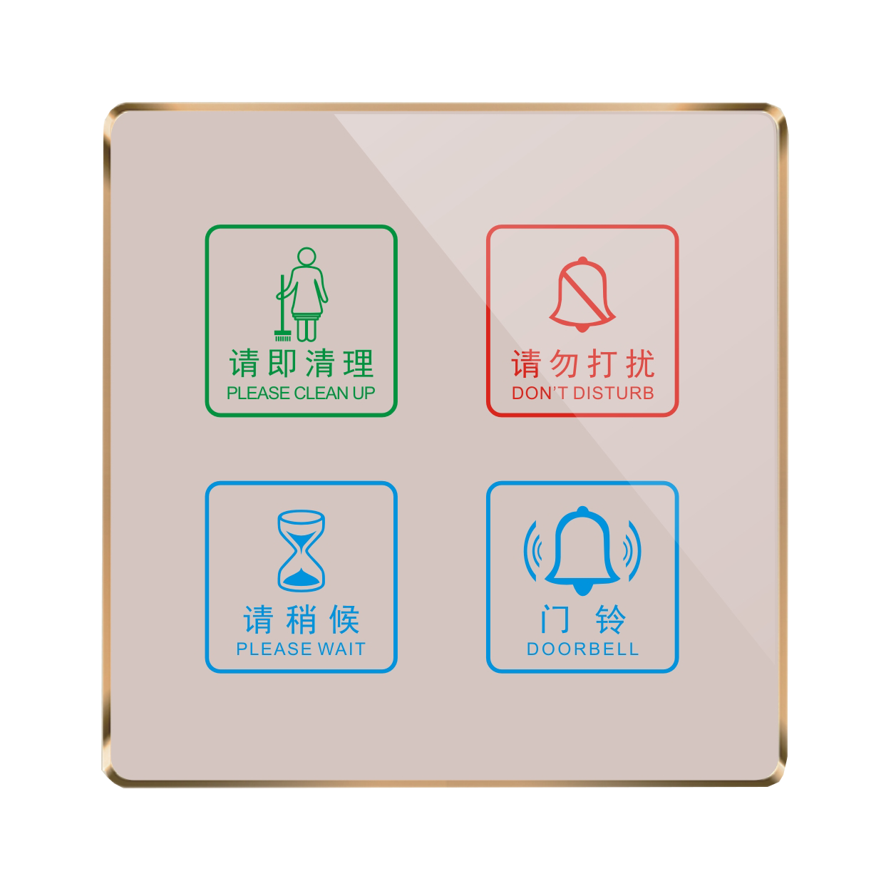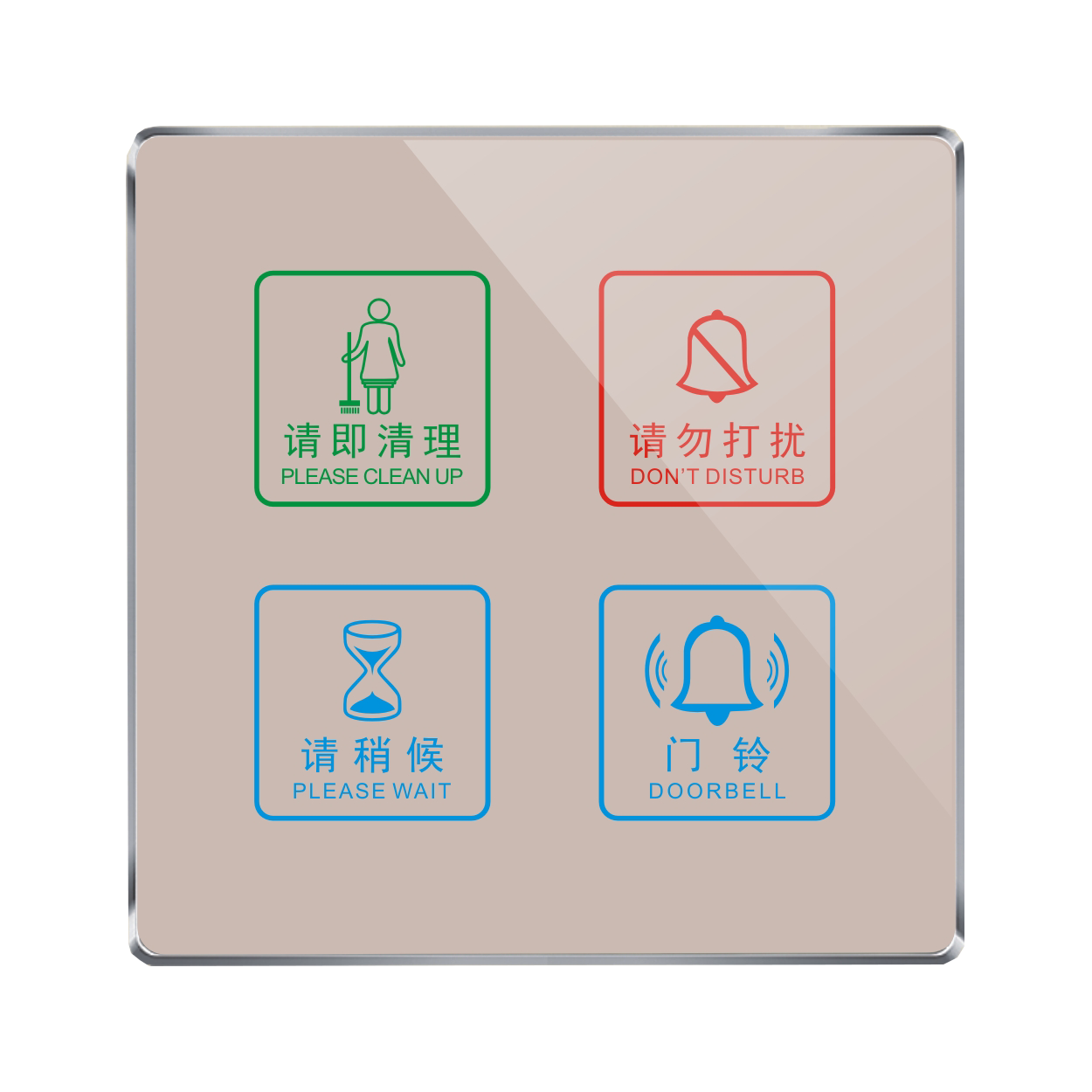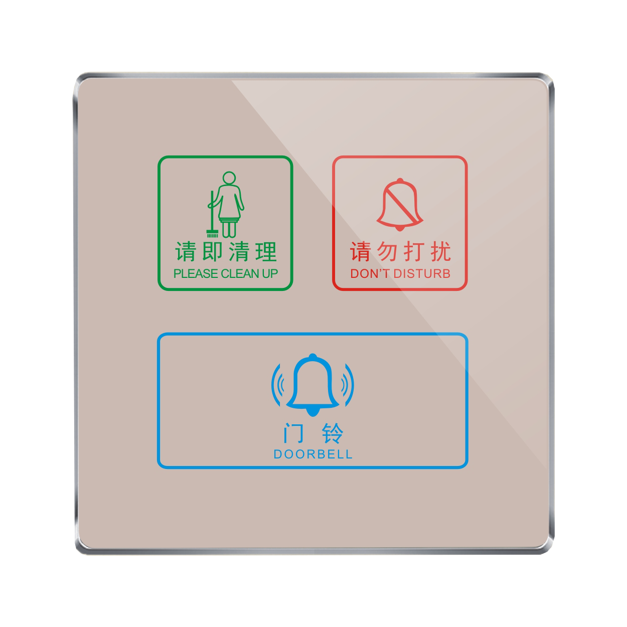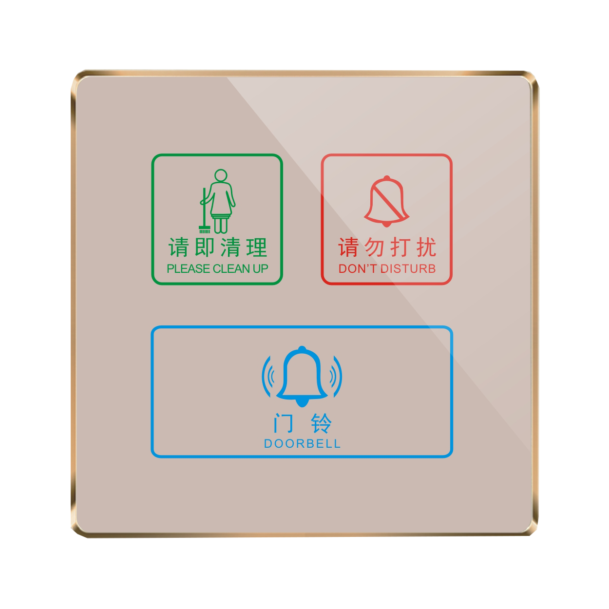 3、客人按下房間內(nèi)的"請(qǐng)即清理”開關(guān),液晶屏的"請(qǐng)即清理”圖案背光亮起, 門外顯示屏中提示房間需要清理。