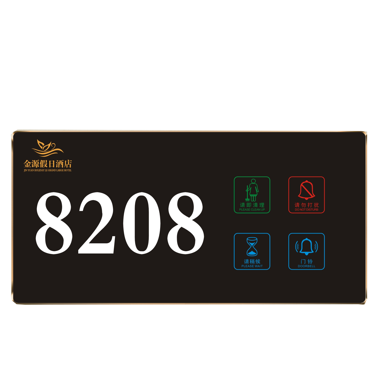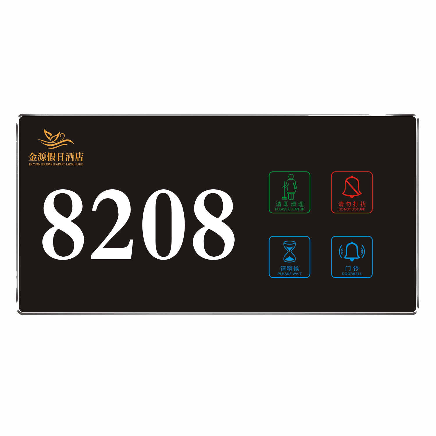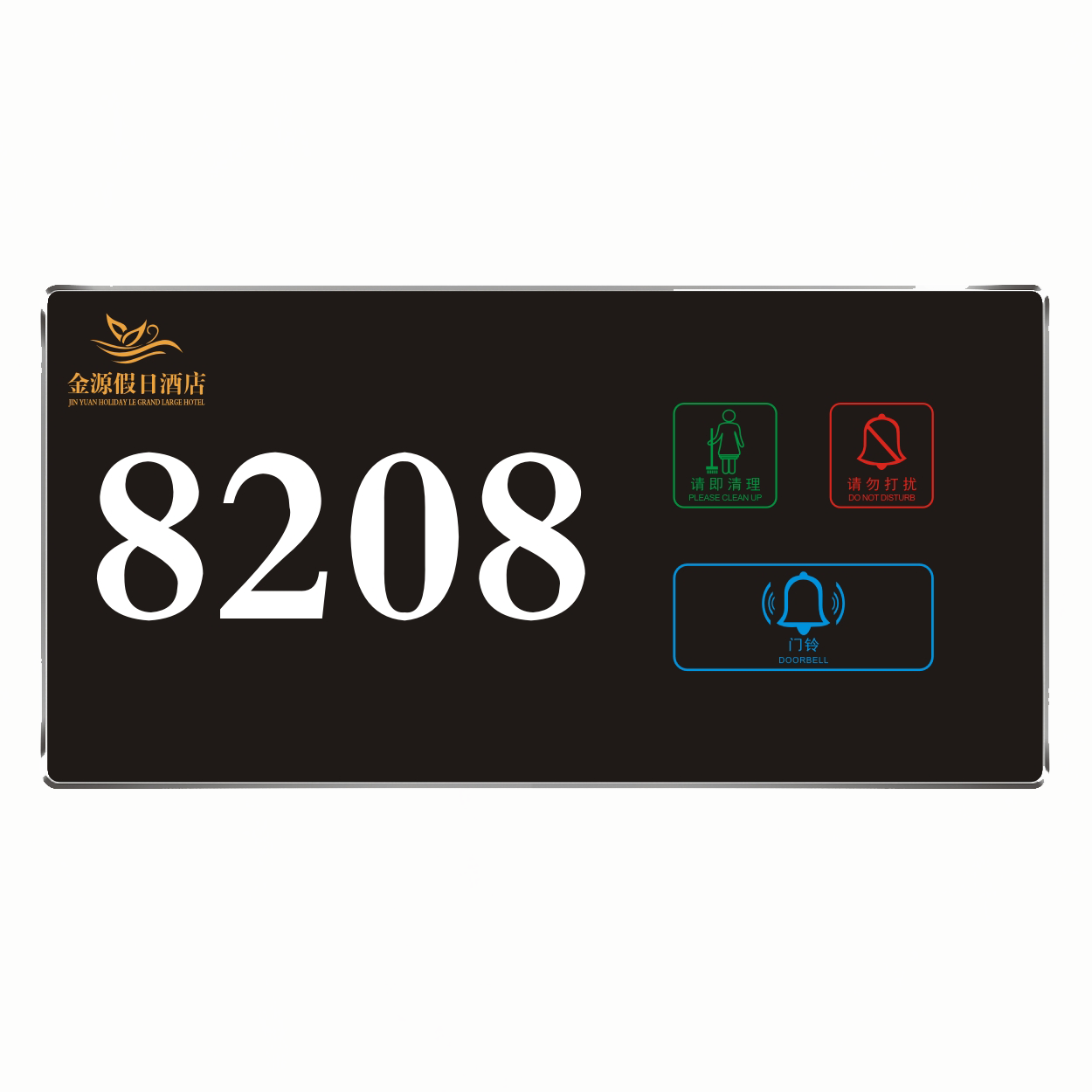 2、客人按下房間內(nèi)的"請勿打擾”開關(guān),液晶屏的"請勿打擾”圖案背光亮起,門外顯示屏中提示請不要打擾,此時門鈴按鍵不起作用。