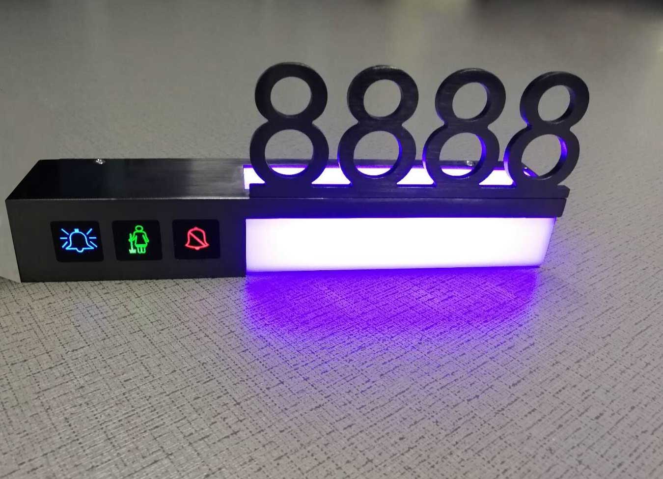 3、客人按下房間內(nèi)的"請(qǐng)即清理”開關(guān),液晶屏的"請(qǐng)即清理”圖案背光亮起, 門外顯示屏中提示房間需要清理。